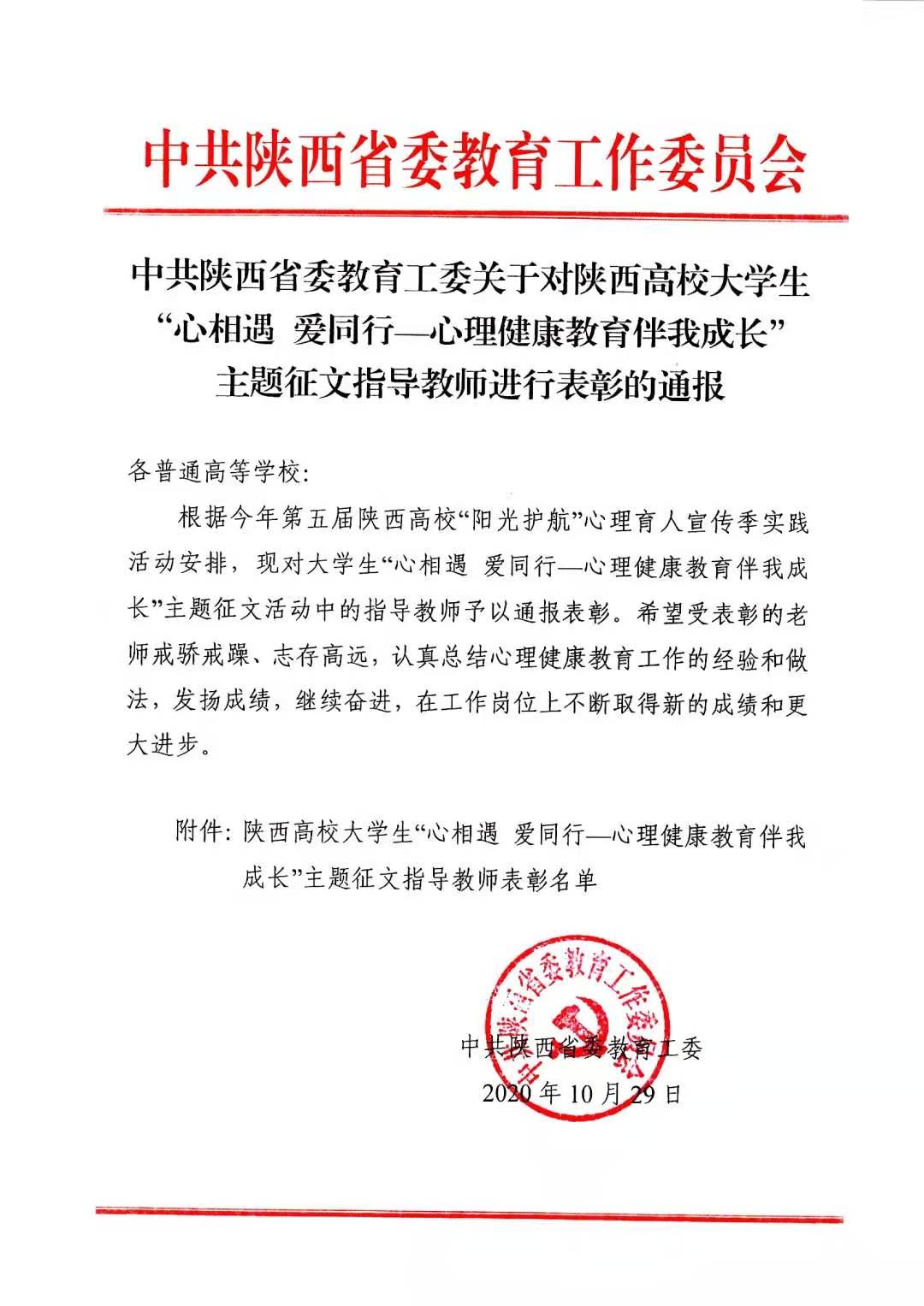 根据今年第五届陕西高校“阳光护航”心理育人宣传季实践活动安排,现对老员工“心相遇 爱同行—心理健康教育伴我成长”主题征文活动中的教师予以通报表彰。