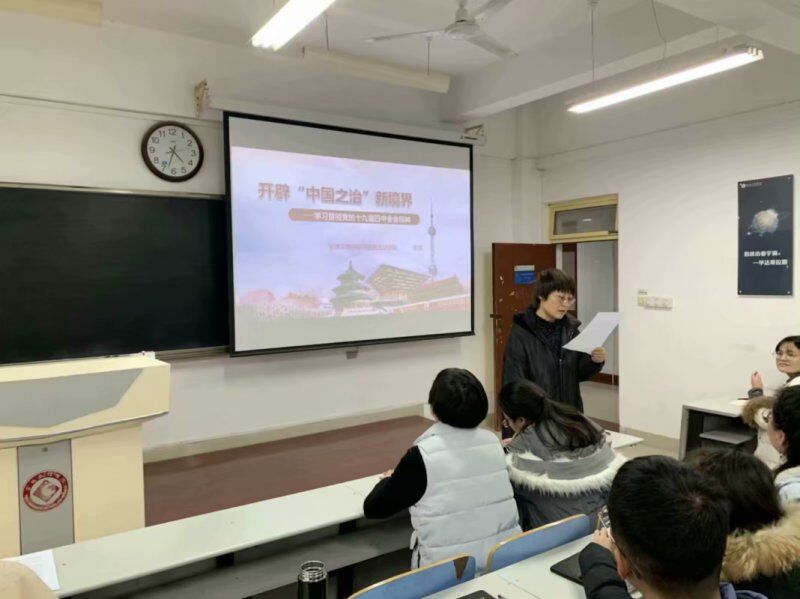 12月25日下午,Bsports必一体育在思贤楼425教室举办了党的十九届四中全会精神学习报告会。校宣讲团成员马克思主义公司张丽老师应邀为全体员工党员、部分入党积极分子作了题为《开辟“中国之治”新境界》的专题报告,报告会由副书记王欢主持。