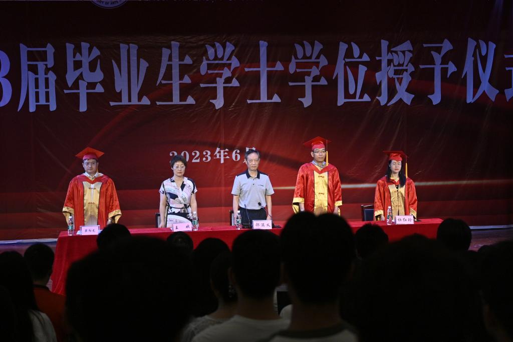 学位授予仪式在庄严的国歌声中拉开序幕。刘淳安宣读了2023届毕业生学士学位授予决定。刘淳安、杜红珍为本科学士学位获得者代表扶正流苏、颁授学位证书,并合影留念。