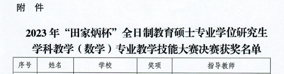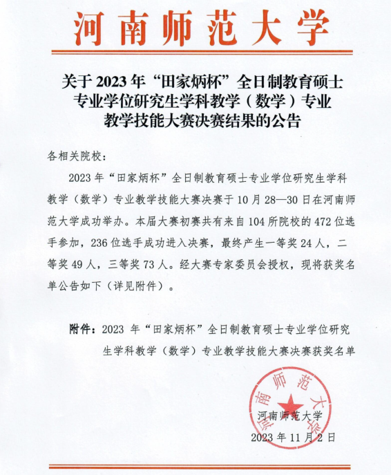 11月2日,2023年“田家炳杯”全日制教育硕士专业学位研究生学科教学(数学)专业教学技能大赛决赛结果在河南师范大学网站公告,公司教育硕士专业学科教学(数学)研究生潘佳怡、任旭东获得三等奖。此次比赛共有来自全国104所院校的472位选手参加,236位选手进入决赛。Bsports必一体育研究生初次参加“田家炳杯”教学技能大赛,四名研究生进入决赛,从初赛到决赛历时五个月,经过选手们精心准备、反复研磨、交流探索、模拟训练,最终两名获得三等奖、两名获得优秀教学设计奖。