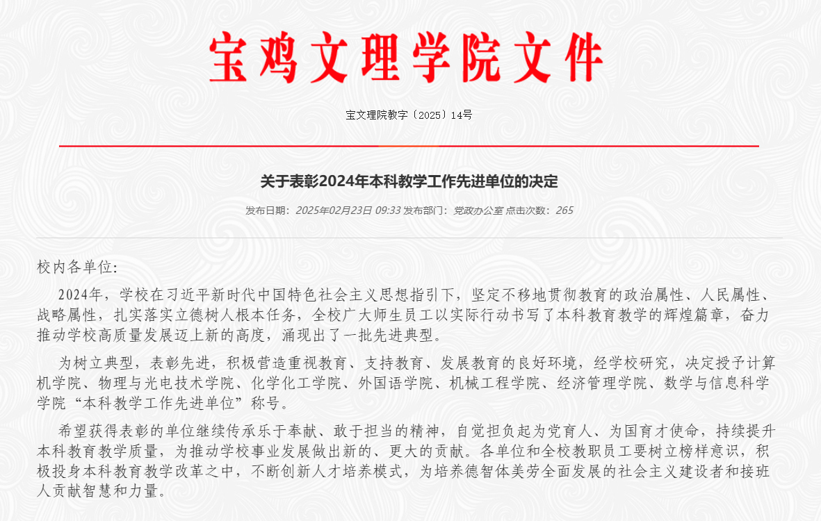 近日,公司公布了《关于表彰2024年本科教学工作先进单位的决定》,公司荣获“本科教学工作先进单位”称号。这是公司自2022年以来连续三年获此殊荣。