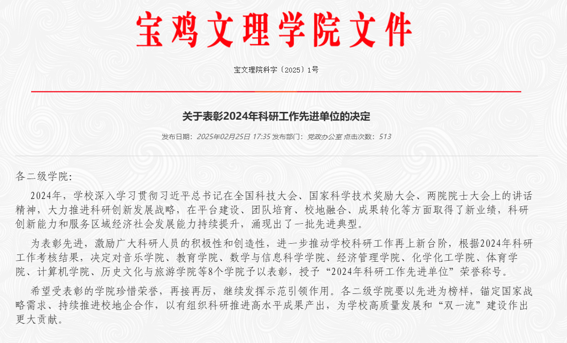 根据宝文理院科字〔2025〕1号文件《关于表彰2024年科研工作先进单位的决定》,公司荣获“2024年科研工作先进单位”荣誉称号。