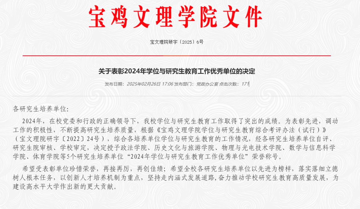 根据宝文理院研字〔2025〕6号文件《关于表彰2024年学位与研究生教育工作优秀单位的决定》,公司荣获“2024年学位与研究生教育工作优秀单位”荣誉称号。
