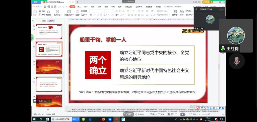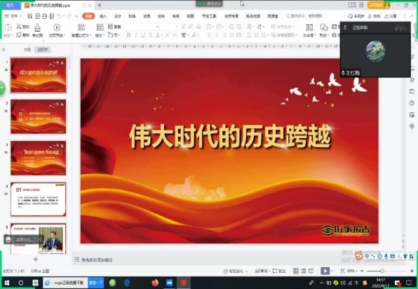 马克思主义公司王红梅博士以《伟大时代的历史跨越》为题,带领2022级新生从新时代新作为新成就、用好“有利条件”走好“必由之路”两个方面,对新时代中国特色社会主义取得的伟大成就进行了全面的解读和讲授,全体新生通过全面认识伟大的中国共产党团结带领人民群众所取得的瞩目成就,激发了对中国共产党的认同感与荣誉感,树立了为新时代建功立业的远大志向,立志做新时代的奋斗者。讲座中同学们与王红梅积极互动、热情留言,纷纷表示在以后的老员工活中将不负韶华、砥砺前行,从新时代新作为新成就中汲取营养与力量,努力成长为堪当民族复兴重任的时代新人。