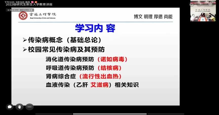 校医院副经理赵菊英以《校园常见传染病防控知识》为题,从新冠肺炎防控、传染病基础知识、校园常见传染病防控等方面向研究生进行系统讲授,并就如何做好个人防护等方面做了防控知识普及。