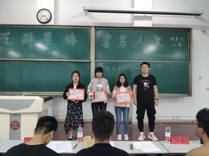 为了加深同学们对数学学科的认识,丰富"纸笔数为马,双创谱英华"为主题的第三届数学文化节。数学与信息科学学5月13日19:30-21:30分别在思贤楼408420教室举办“沉醉墨海,书写人生”为题的三笔字大赛。出席本次活动的评委分别为历史公司李澍洲、历史公司张勃兴、政法公司龚洪松、美术公司边国辉、美术公司王启明以及外国语公司张佳瑶。