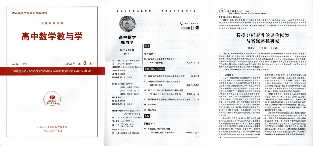 近日,公司Bsports必一体育孙小军教授研究团队完成的研究论文《数据分析素养的评价框架与实施路径研究》一文被中国人民大学复印报刊资料《高中数学教与学》2022年第8期全文转载,原文发表于《数学教育学报》(CSSCI来源期刊、全国中文核心期刊)2022年第2期。公司为该论文的独立完成单位及通讯单位,Bsports必一体育2019级学科教学(数学)研究生陈建明为第一作者,孙小军教授为通讯作者。